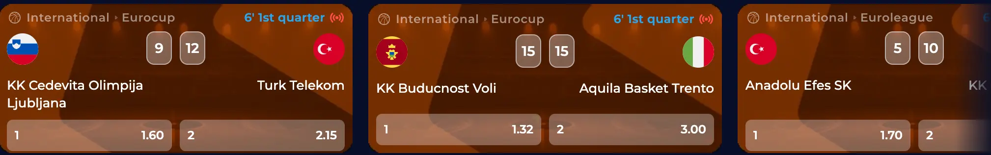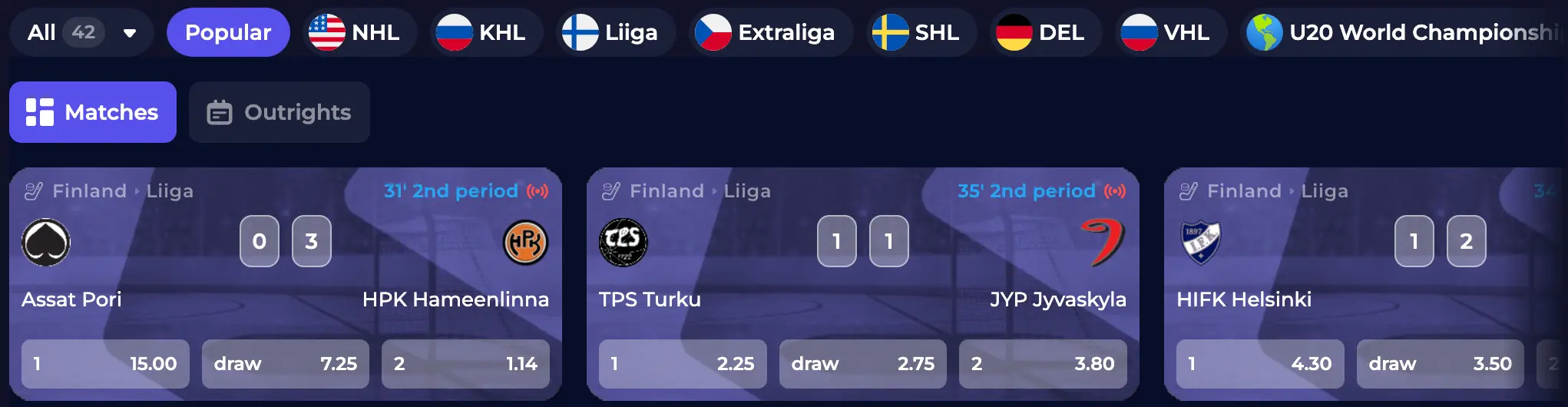 As on any other legitimate and trustworthy site, it’s possible that you place wagers via two modes: live/in-play and pre-match. In-play wagers are usually more enjoyable, as you can win when rooting for your favourite team or player online. You can make use of our accurate odds just while watching the match. And as of now, this is the most popular mode on the website. You can switch to it by tapping the button “Live” under the left menu. There will be a special bar on the upper part of the screen, where punters can toggle between diverse options, such as soccer, tennis, Dota 2, FIFA, cricket, ice hockey and more.