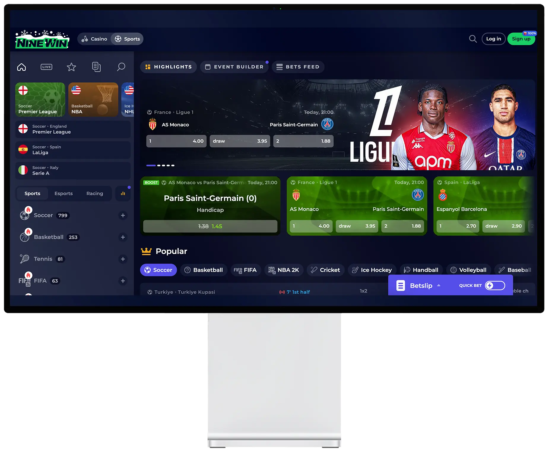 On the left menu bar, you’ll find all the Nine Win sports betting options we have now. If you click on “Soccer”, we’ll redirect you to the page, which has neatly categorised sections, such as popular, live and upcoming events. Additionally, we will provide betting markets and accurate odds. If you already know what you’d like to wager on, you can make use of the “+” button to see a full list of countries and leagues currently available on the website. The Premier League, EFL Cup, Bundesliga, Coupe de France, Champions League and many others are all here.