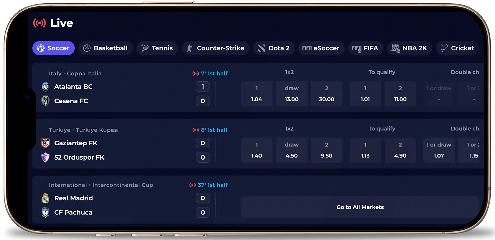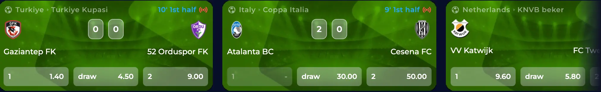 Also, if you tap this section, you can toggle between these options with one click, as they are all in one place. 1×2 and total are two major options available now. We believe you’ll have some real fun with us. Don’t forget to make use of our countless bonuses and free bets.
